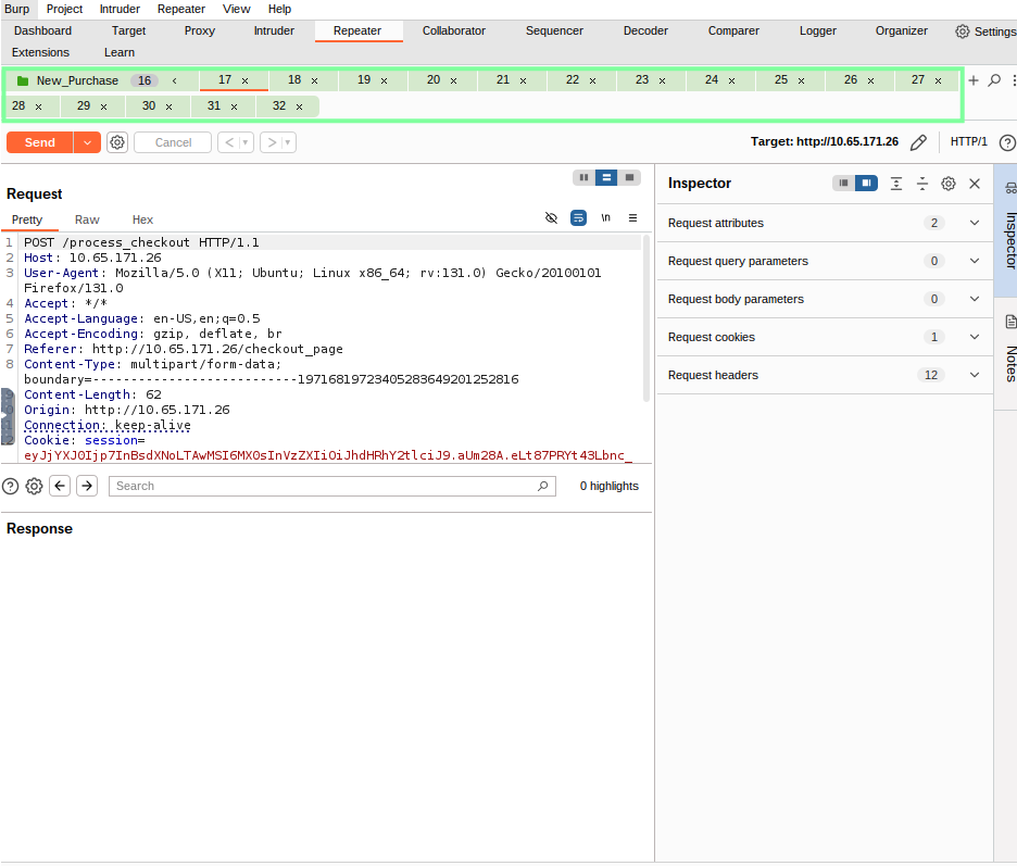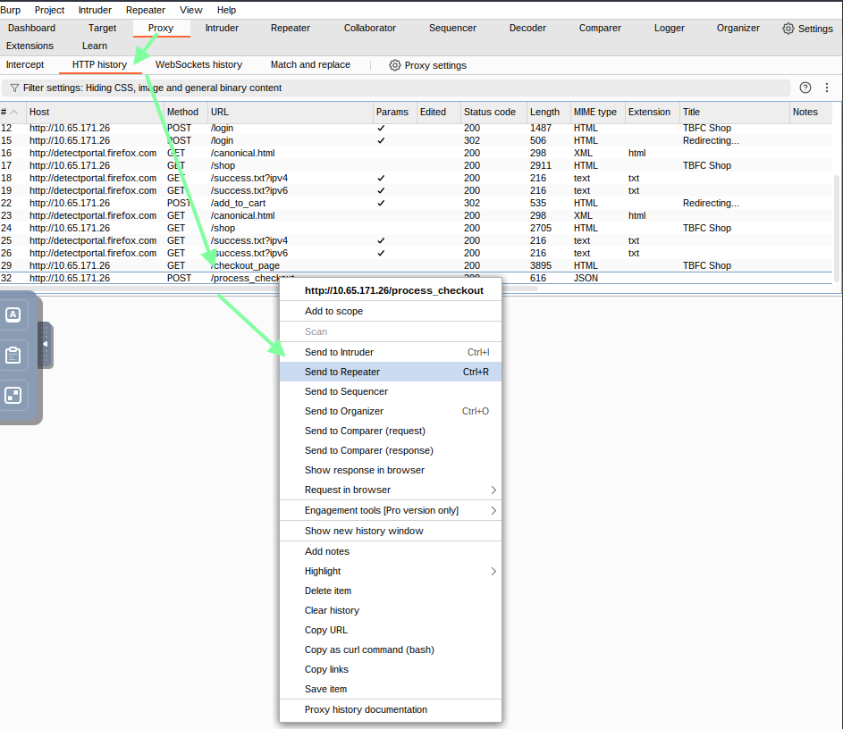 We follow through with checking out an order and head back to BurpSuite to perform the Repeater ability.