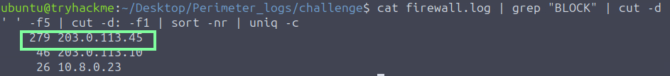 For question, “In the WAF Logs, which single source IP is responsible for all the blocked web attacks?”. Scroll to find the blocked requests. You could use grep to make this easier if you wish.