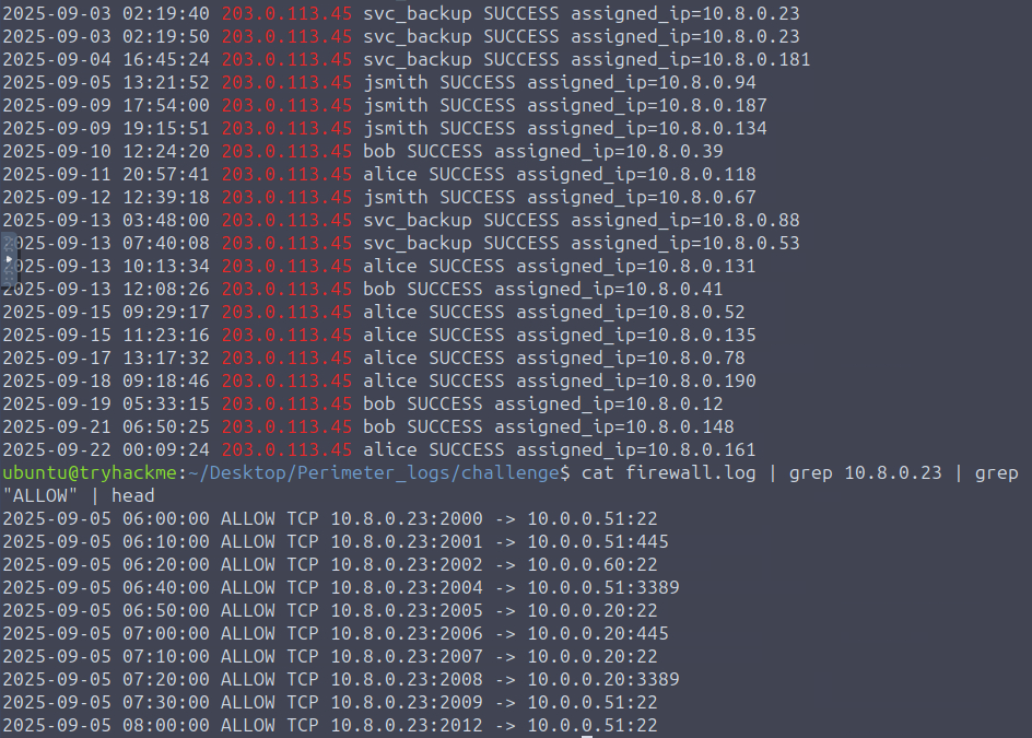 “In the VPN logs, how many brute-force attempts failed?”. In order to obtain this and make it easier for ourselves, we need to focus on the FAILED_AUTH. There are too many to count so lets use grep to do the job for us.