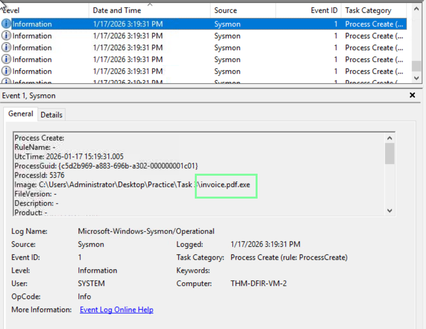 After you find the invoice.pdf.exe event, the next one or two event will have the command they entered!