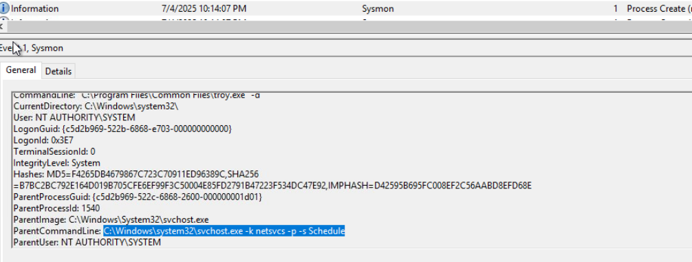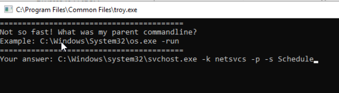 “What flag do you get after finding and running the Troy malware?” Since we know we are looking for “troy.exe”, I used the find feature to quickly locate it. In the same event with the command, scroll down to locate the ParentCommandLine.
