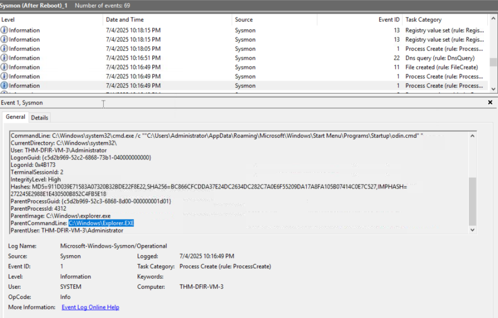 Again, I use the find action to filter through and obtain this. When you locate odin in the command line, scroll down to the ParentCommandLine to obtain the answer.