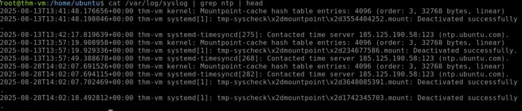 At first, I ended up entering “cat /var/logsyslog | grep time” but then I noticed ntp and changed the command to match that to obtain “ntp.ubuntu.com” for the answer.