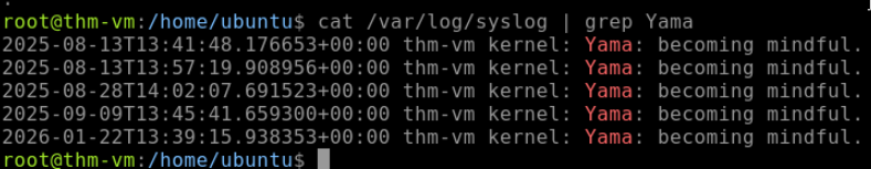 “What is the kernel message from Yama in /var/log/syslog?”
