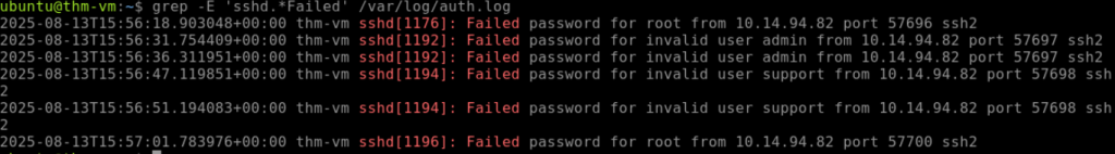 I ended up going by the examples given by THM and did cat /var/log/auth.log | grep -E ‘ssh|Failed’ but this was outputting ssh OR Failed. I thought, “This needs to be more exact!” I used Duck AI to assist me in obtaining a better command going forward, which ended up being ‘grep -E ‘sshd.*Failed’ /var/log/auth.log’!
