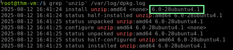 “According to the VM’s package manager logs, which version of unzip was installed on the system?