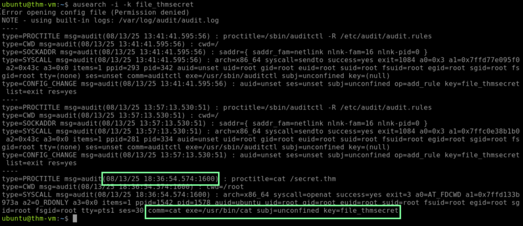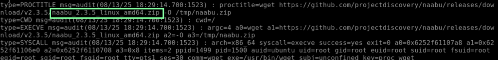 When you enter the command “ausearch -i -k proc_wget,” you will see a lot of log information, but thankfully, THM breaks it down for us.