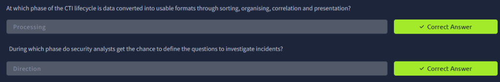 THM presents a fictional scenarior that cover the phases of the CTI lifecycle. Per THM, “Cyber Threat Intelligence follows a six-phase intelligence lifecycle that transforms raw data into contextualized and action-oriented insights geared towards triaging security incidents.”