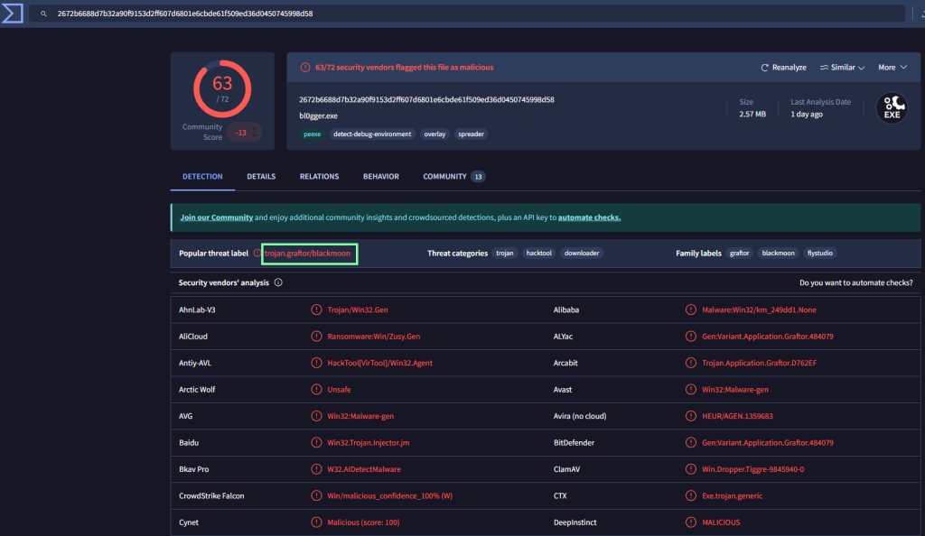 “On VirusTotal, what is the threat label used to identify the malicious file?”