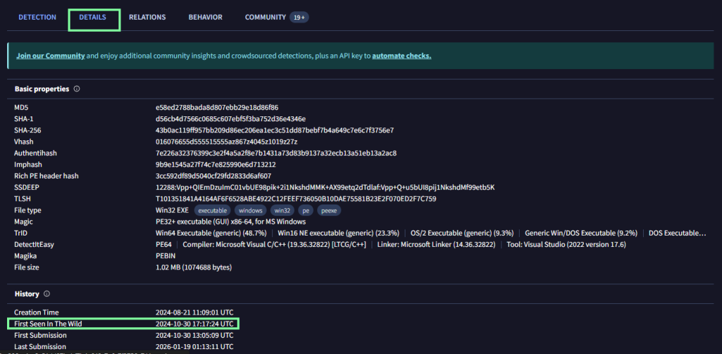 “When was the first time the file was recorded in the wild? (Answer Format: YYYY-MM-DD HH:MM:SS UTC)”