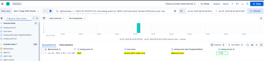 “What is the winlog.record_id of the Administrator 4624 logon event?