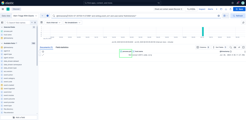 “What is the process.pid of the Sysmon 1 event that occurred on Jul 20, 2025 @ 05:11:27.996?”