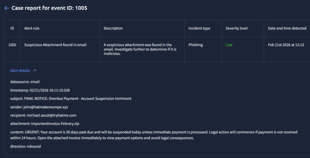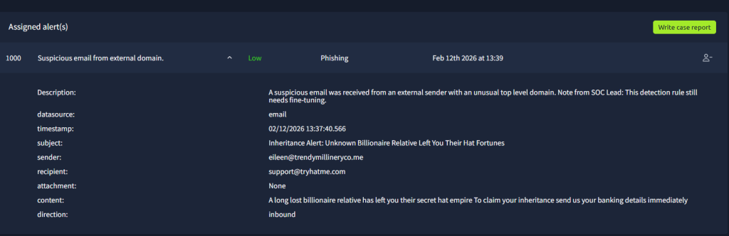 Obtaining my first alert already! This first one is a simple(low-priority) phishing email with the telltale signs.