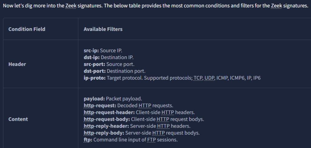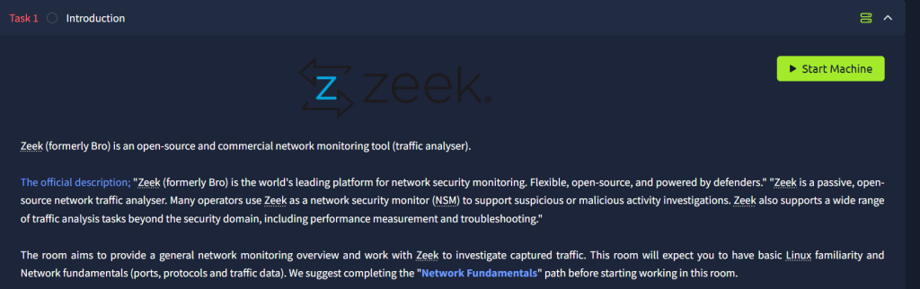 There is a lot of reading material in this room. I did know of Zeek beforehand, but this will be the first time getting hands-on with it. Most of us probably think of Wireshark when it comes to packet analyzing, but THM shows the power that Zeek has with its technical capabilities. Zeek is also compared to Snort in task 2, Network Security Monitoring and Zeek.