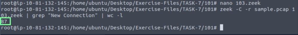 Investigate the sample.pcap file with 103.zeek script. Investigate the terminal output. What is the number of the detected new connections?”
