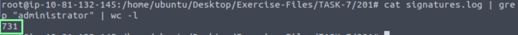 “Investigate the signatures.log file. What is the total number of “administrator” username detections?”