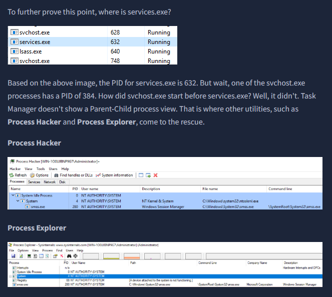 They bring up two additional utilities: Process Hacker and Process Explorer. I’ve used the latter in other THM rooms.