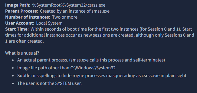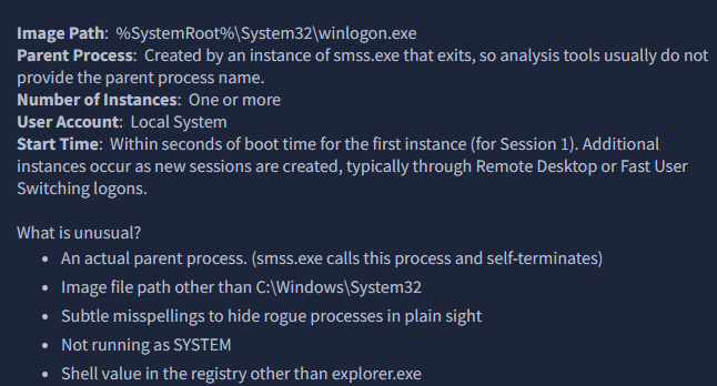 “In this room, we will explore the core processes within a Windows system. This room aims to help you know and understand what normal behaviour within a Windows operating system is. This foundational knowledge will help you identify malicious processes running on an endpoint.”