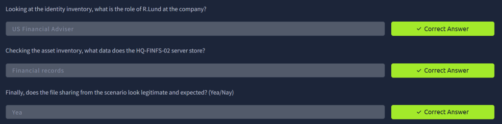 In Task 2, THM covers the two most important things of an IT infrastructure: assets and identities. “Identity inventory is a catalogue of corporate employees (user accounts), services (machine accounts), and their details like privileges, contacts, and roles within the company,” and “Asset inventory, also called asset lookup, is a list of all computing resources within an organization’s IT environment”. The room gives various examples of both assets and identities, and the way those are viewed from different software/infrastructures.