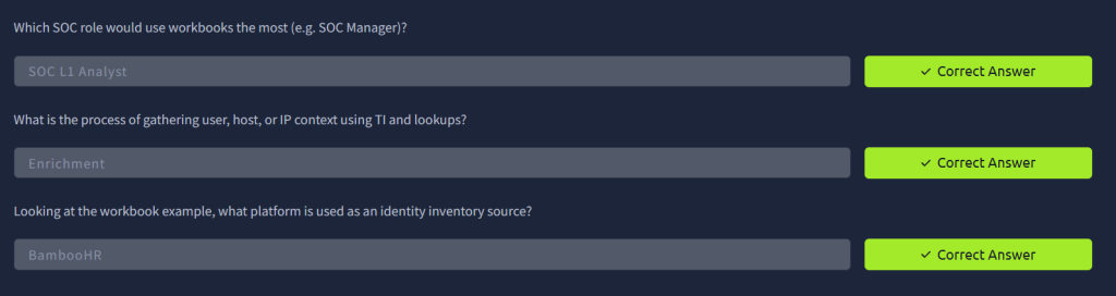 “Alert triage is a complex process that often requires analysts to gather additional information about affected employees or servers. This room explores SOC workbooks designed to streamline alert triage and explains various lookup methods to quickly retrieve user and system context.”